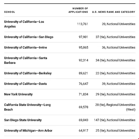 位居二、三位的分别是加州大学圣地亚哥分校和加州大学欧文分校,分别有97,901人和95,065人申请。前十中收到申请数量最少的为密歇根大学安娜堡分校,共收到了64,917份申请。