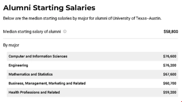 虽然德州奥斯汀录取难度大,但其教育资源及就业前景相当不错,校友中期薪资也有着不俗的表现。