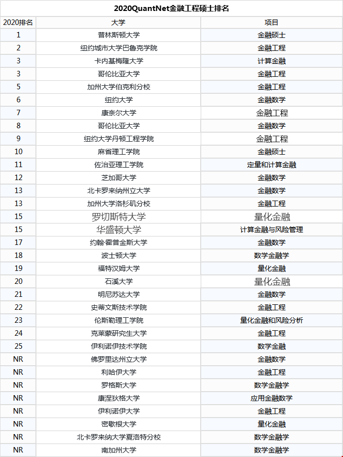 日前,QuantNet公布了2020年美国金融工程硕士排名!