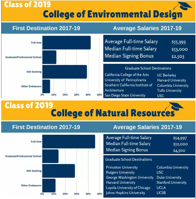化学学院毕业生找工作和继续读研的比例差不多,读研学校除了自己 UC 系,还有 MIT、加州理工、宾大、芝大等高校。工作平均薪资为 $64,580,比文理学院的毕业生低一点。