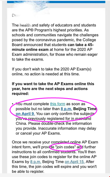 1.如果你要参加本年度线上AP考试(主要针对:在中国大陆地区注册考试的社会学生),请在北京时间4月9日前,填写表格(邮件附带链接)。