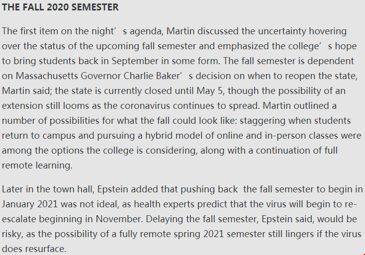 也就是说,阿默斯特学院计划2020年秋季如期开学,但校长目前正在纠结一个问题:选择全面线上授课还是线上与线下授课相结合的教学方式……