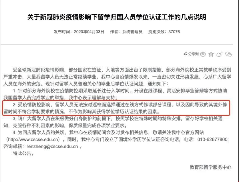 也就是说:留学生疫情期间在国内上网课不影响学历认证!