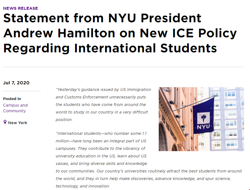 纽约大学对于美国ICE政策有什么看法?周一自从美国ICE发表了新的政策之后,多所大学都进行了相关的发布声明,都表示该政策对于国际留学生非常的不友好,纽约大学也发布了相关的声明,一起来看一下吧!