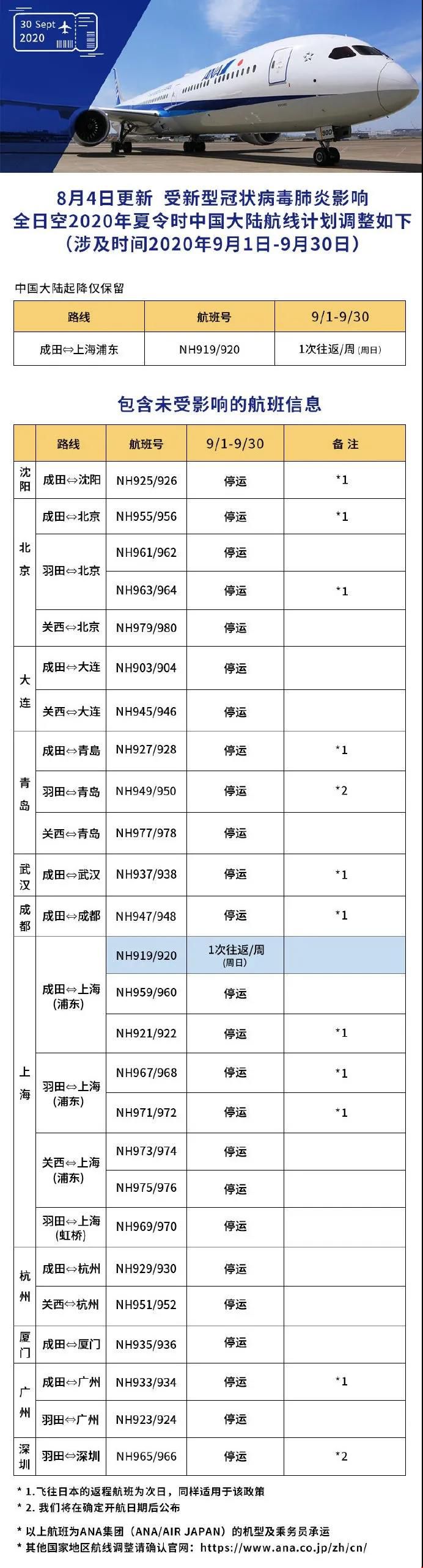 受新型冠状病毒影响,全日空航空将继续对部分城市的航班进行调整。中国大陆仍仅保留上海往返成田航线(NH920/NH919)每周日运航一班。