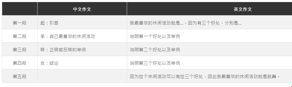 在英文作文里必须在第一段就表明自己的论点,并且有三个中心思想,也就是三个原因去支持自己的论点,而第二到四段分别将三个原因说明并举例,结论则是重申三个中心思想以及自己的论点,这样才能够在写作拿到高分。