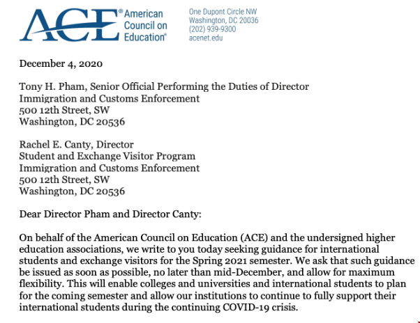 本月早些时候,美国几十家高等教育行业协会联名写信给美国国土安全部官员,要求其尽快明确美国政府对于2021年春季学期留学生的签证政策,以便学校及时采取相应措施。