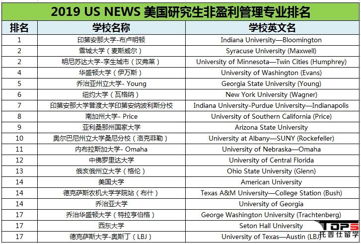 以下是2019 US NEWS 美国研究生非盈利管理专业排名:
