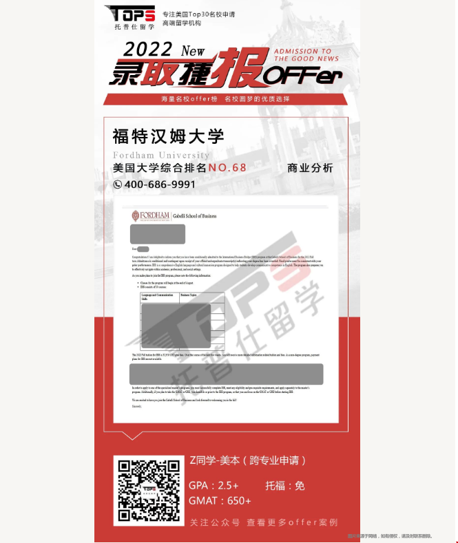 托普仕学子Z同学拿到了福特汉姆大学商业分析的录取。学生本身就读的经济专业,但是想申请金融商科类研究生,并GPA很低。对于商业分析专业申请来说,需要一些前期课程,因此服务团队梳理了Z同学的三段实习,并安排建议补充了Java,python技能。目前的录取来说,正课之前仍需要补充一些前期课程。
