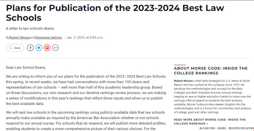 但就在2023年1月2日,U.S. News首席数据策略师罗伯特·莫尔斯给法学院院长发了一封公开邮件,信中表示:将对2023-2024年排名进行一系列调整。