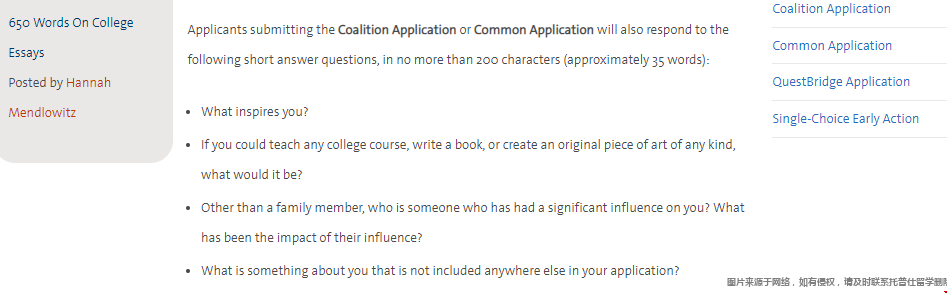 提交Coalition Application或Common Application的申请人还将在200个字符以内(约35个字)回答以下短回答问题: