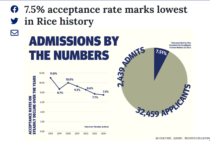 根据官方消息,2024fall莱斯大学从32,459名申请者中录取了2,439名学生,总录取率仅7.5%,连续第三年创下录取率新低。此前报告称,203fall和 2022fall的录取率分别为7.7%和8.56%。