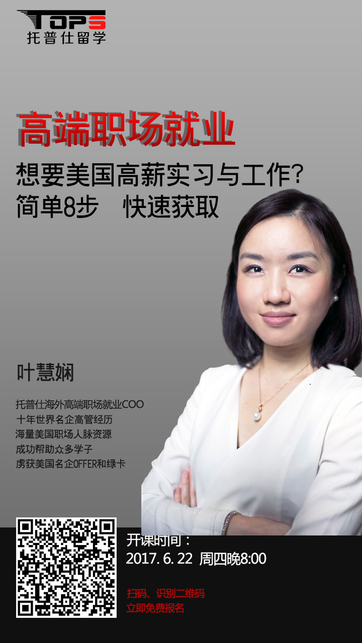 叶慧娴,托普仕海外高端职场就业coo,十年世界名企高管经历,海量美国职场人脉资源,成功帮助众多学子,虏获美国名企offer和绿卡。 ...