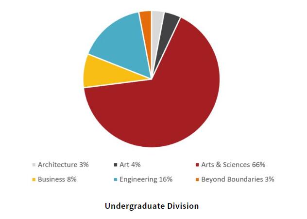 录取学生学习文理学科占比66%,工程占比16%,商科占比8%,艺术占比4%,建筑占比3%,还有3%的学生为跨学科专业。