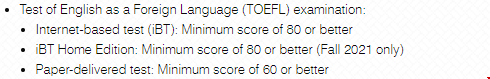将接受 TOEFL iBT Special Home Edition 考试。相同的最低分数适用,但是不接受针对中国的 TOEFL ITP Plus 考试,规定最低新托福考试最低分数达到80。