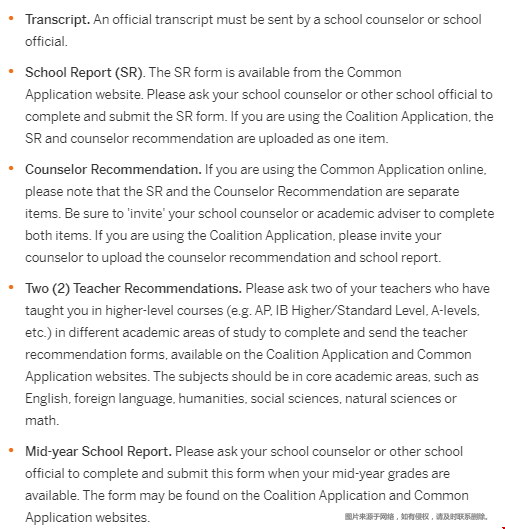 c.顾问推荐信:如果您在线使用 Common Application,请注意 SR 和 Counselor Recommendation 是单独的项目。请务必“邀请”您的学校辅导员或学术顾问完成这两个项目。如果您正在使用 Coalition Application,请邀请您的辅导员上传辅导员推荐和学校报告。