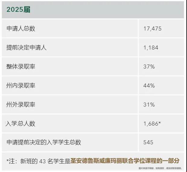 威廉玛丽学院2021秋季本科共计有17475名学生申请了2025级入学,州外录取率为31%,另有845名学生申请了秋季转学入学,转学录取率达到53%,高于以往春季转学转学录取率,2025届新生总计有1686名学生入学报到(*注:43名学生就读于圣安德鲁斯威廉玛丽联合学位课程)。