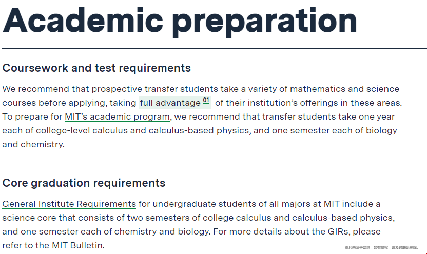 我们建议准转学生在申请前学习各种数学和科学课程,为了准备麻省理工学院的学术课程,我们建议转学生学习大学微积分和微积分物理各一年,生物和化学各一学期。两个学期的大学微积分和基于微积分的物理,以及化学和生物学各一个学期