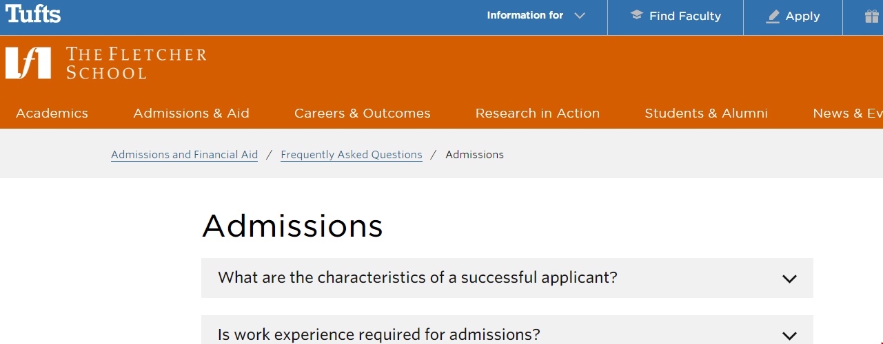 温馨提示:虽然强烈建议我们所有学位课程都有工作经验,但经验的数量和具体类型会因申请的课程而异。招生委员会仔细审查每个申请人的个人和专业经验,以评估在弗莱彻研究生学习的准备情况。志愿职位、实习以及兼职和全职经验都在为学生的学习做好准备方面发挥着作用。