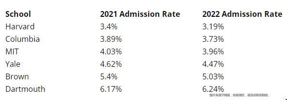 美国常春藤盟校的录取率要低很多。2021年,常春藤的平均录取率为5.4%左右,2022fall本科录取率大致在4%左右,不到5%,所以常青藤录取难度也在增加,例如:哈佛本科录取3.19%;哥伦比亚大学本科录取率3.73%等等。