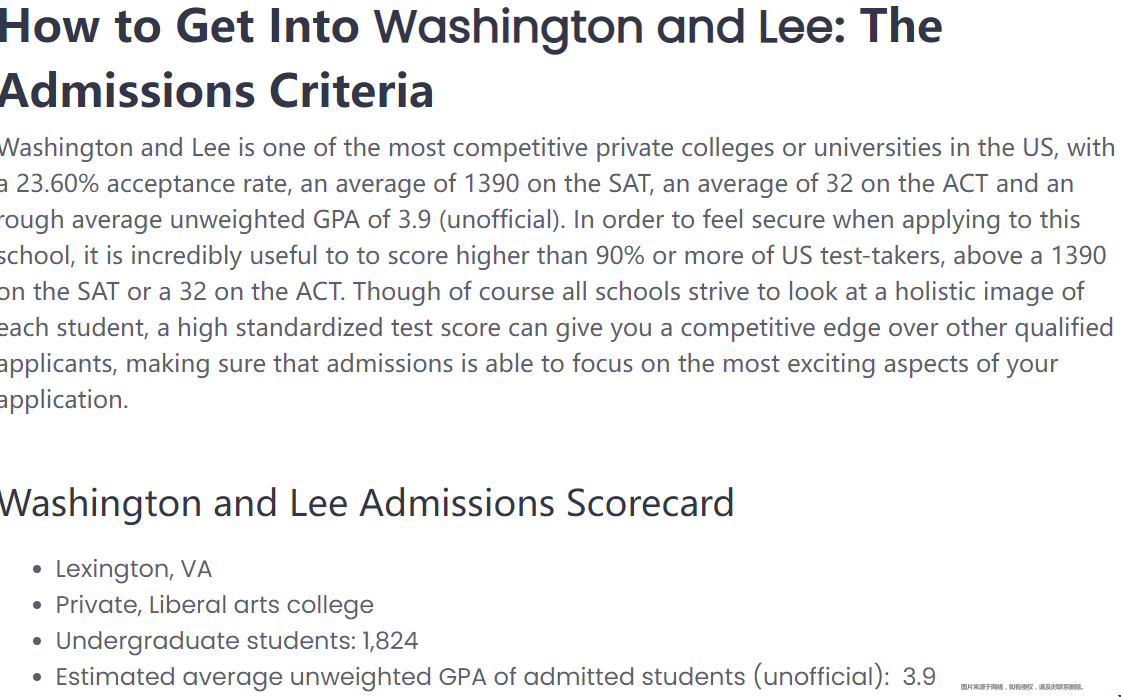 回答:华盛顿与李大学是美国最具竞争力的私立学院或大学之一,录取率为23.60%。SAT平均为1390,ACT平均为32,未加权GPA粗略平均为3.9。为了在申请这所学校时感到安全,在SAT1390分或ACT32分以上的美国考生中得分高于90%或更多是非常有用的。