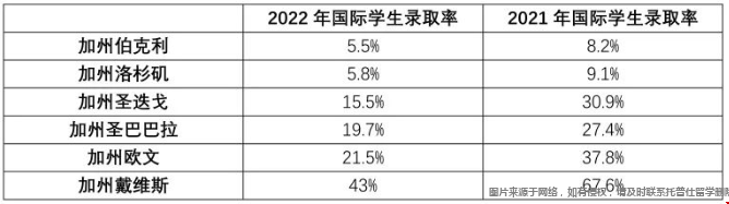 但是需要托普仕老师提醒大家的是,虽然刚才我们提到加州大学普遍申请者很多,录取的数量较大,但如果将国际学生单独来看,那么国际学生的录取率在今年是出现了大幅下降,特别是加州伯克利和加州洛杉矶两所大学,国际学生录取率已经降到了5%左右,这个实际上已经接近藤校范围。