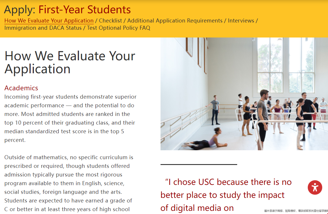 与此同时,学生需要在文书或推荐信中表达他们愿意接受新的事物,能快速适应新的环境。USC大学并且指出了学生是否有为他所在的社区和生活环境贡献了自己的一份力量也是申请考核的一部分。