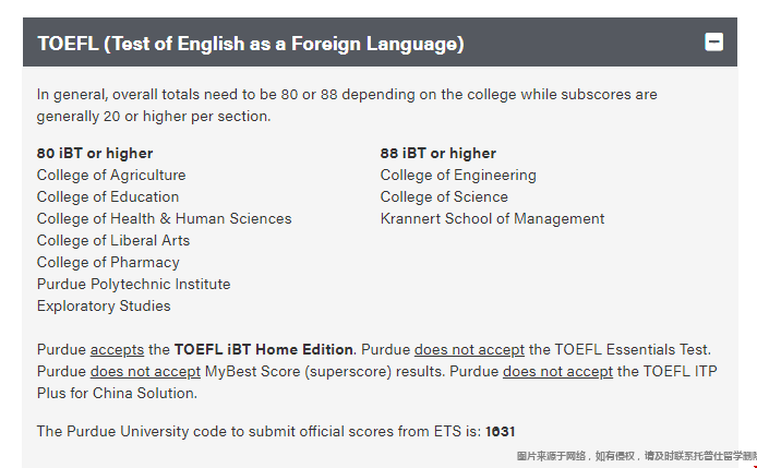 例如:申请普渡大学这7个本科学院需要托福网考最低80ibt