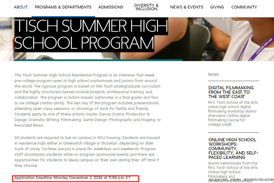 NYU Tisch暑期艺术夏校提供电影、戏剧、舞蹈、写作、音乐、摄影等多个领域夏校项目,最终授予4-6个学分不等,适合高中生申请,据悉,2025年NYU Tisch暑期艺术夏校申请时间已经临近截止,大家务必要抓紧,下面就随托普仕留学老师一起来看看吧!