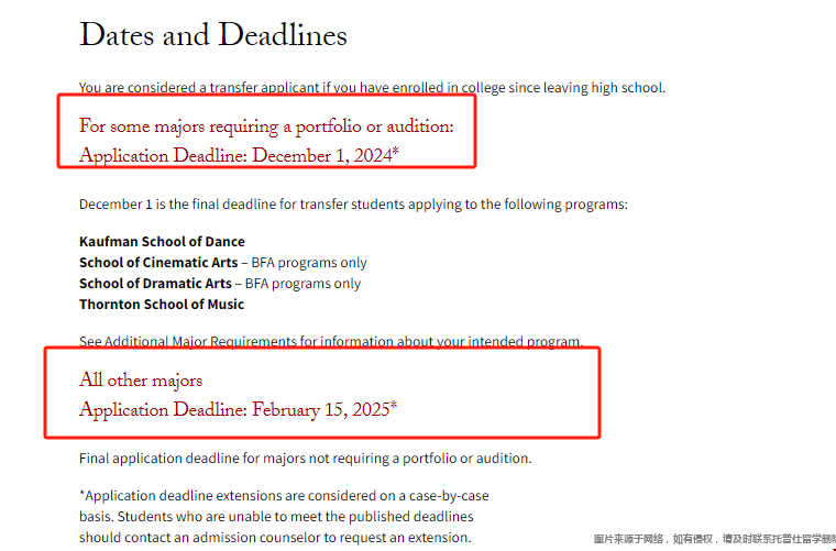 由于本科直申难度较高,所以很多人梦想通过转学来进入南加大,那么南加大转学截止什么时候呢?根据托普仕留学老师从官网获悉,常规专业截止2月15日,艺术类可能已经12月过期,下面就随老师一起来详细看看吧!
