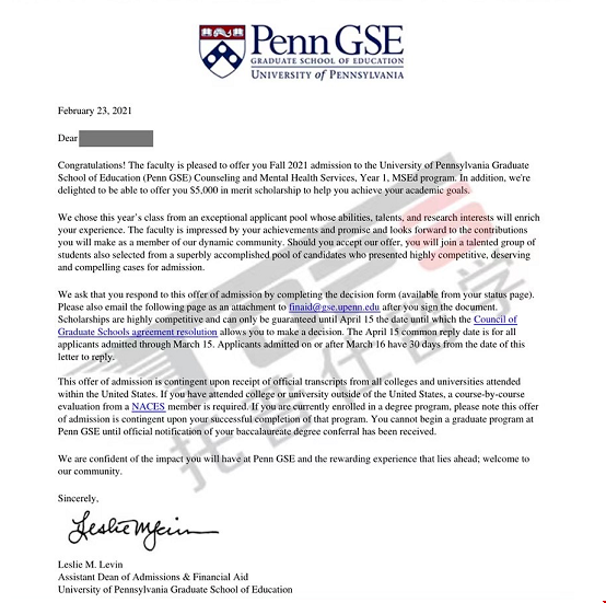 最终录取结果也没辜负W同学对托普仕的深度信任,收到了常春藤大学之一的宾夕法尼亚大学录取,这个录取结果也让他十分满意,还特意给所有的服务老师表达了感谢!