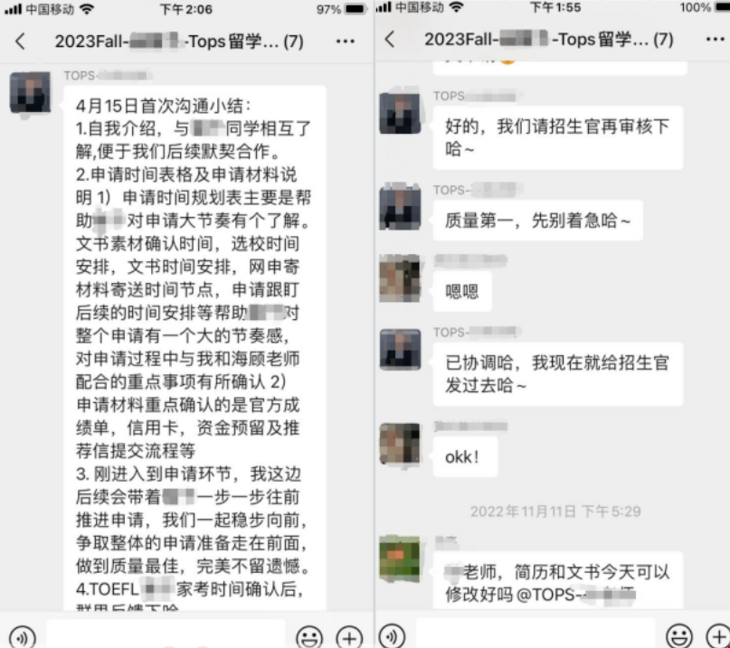 一开始家长对于留学费用是有一些顾虑的,但随着深入了解C同学家长了解到托普仕留学是五位老师服务一名学生,为了保证服务质量,一个团队最多服务10名学生,同时还有专业专业对口的海外顾问,以及招生官对整体文书的把关等一些服务细节。C同学家长对托普仕限制服务人数保障申请透明及定制化专业化的服务承诺,还有美国TOP30专业对口的海外顾问和招生官师资都非常认可,最终顾虑打消确定了跟托普仕留学的合作意向。