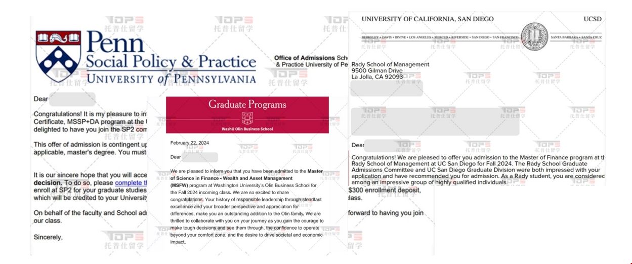 Z同学背景丰富,积极配合服务团队老师,提前做好规划,完成高质量文书,最后成功拿到了宾夕法尼亚大学、加州大学圣地亚哥分校和圣路易斯华盛顿大学华盛顿大学的offer