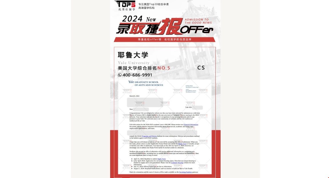 以上就是近期耶鲁大学OFFER的相关内容。如果您对美国留学感兴趣,欢迎您在线咨询托普仕留学老师(Tops6868)。托普仕留学专注美国TOP30名校申请,采用5v1服务模式,21步精细服务流程,硬性四维标准+六维背景提升等留学服务体系,为学生申请美国名校提供保障。