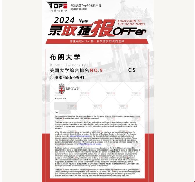 X同学在大三下学期咨询到托普仕留学,想去TOP校攻读CS方向,在了解到托普仕的师资和成功案例后与托普仕携手。针对CS名校申请来说,科研是非常重要的维度。基于科研薄弱的情况,服务团队规划其参与了一段名校科研项目,并获得了论文发表机会。忙碌的科研实习和课业让X同学无暇考GRE,最终选择了无G申请。高效率的申请与高品质文书助力学子首战告捷拿下布朗CS项目录取。