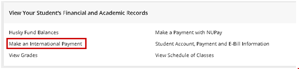 要通过myNortheastern学生门户网站在线进行付款,请在“学生金融服务”下选择“服务和链接”和“进行国际付款”。