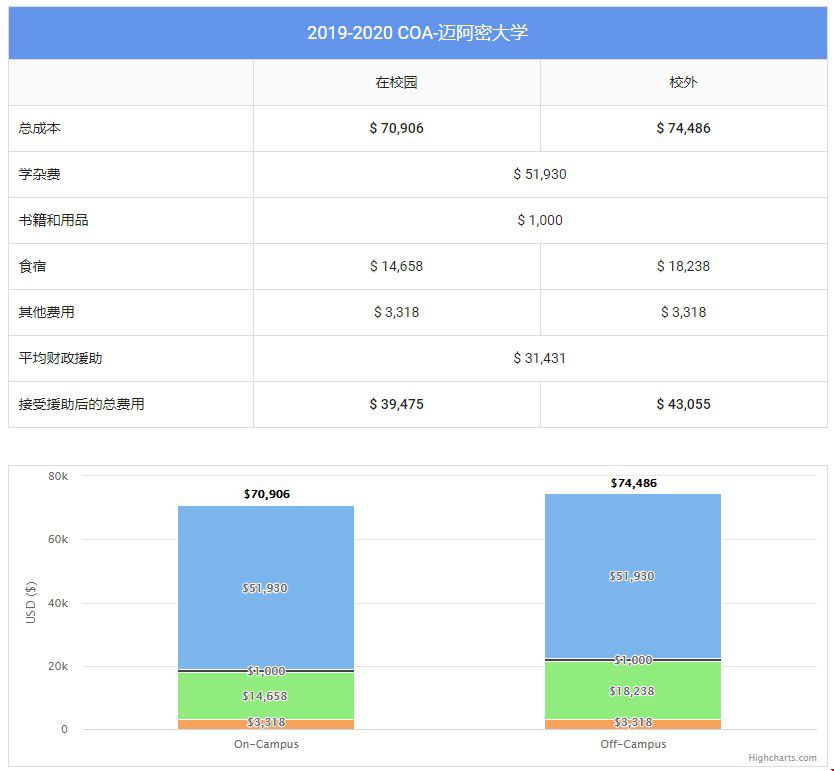 迈阿密的总费用为70,906美元(学生在校园内生活)和74,486美元(校园外),在2019-2020学年。包括学费,杂费,书本和用品费用,食宿费和其他生活费用。