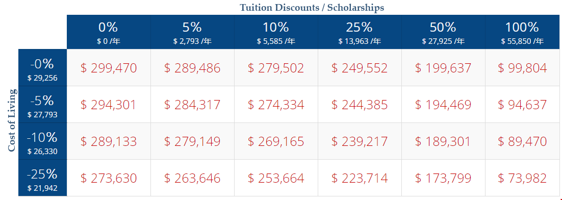 下表使用以上假设来估算各种情况下的债务。这些数字没有反映出提前还贷,毕业后的标准六个月宽限期以及利息。我们假设奖学金金额保持不变,并且不会随着学费的增加而扩大。但是,我们确实假设学校的估计生活费用所占的百分比随年增长而增加。