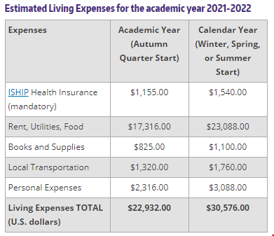 2021-2022华盛顿大学研究生总计学费+生活费一年: