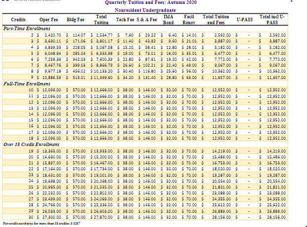 注册的MD或DDS项目不收取该附加费,注册的JD或PharmD项目的学生将免收该附加费。请注意,在一个季度内修10个或以上学分的本科生将按全日制收费,修7个或以上学分的研究生或修13个或以上学分的MD或DDS学生也将按全日制收费。