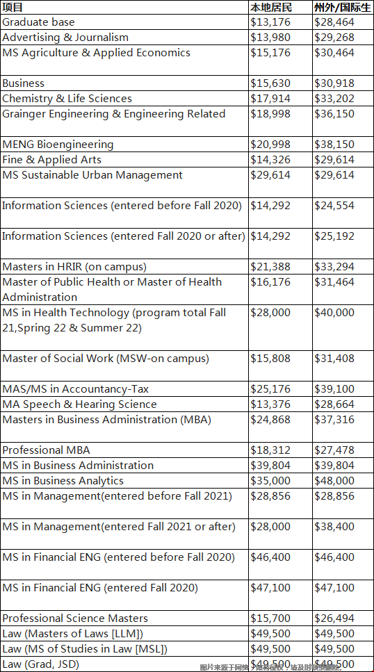 以下是2020-2021伊利诺伊大学香槟分校研究生留学学费列表: