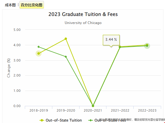 当然了,芝加哥大学研究生的学费州外和州内有着很大的差别,包括涨幅在内,以下是芝加哥大学学费与往年相比的百分比变化图: