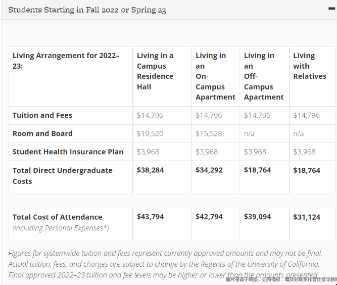 加州大学河滨分校2022-23新生州内学生的学费为$15,917美元;国际生的学费需要再加上$31,026美元,学费为$46,943美元。食宿费预估为$18,150美元。