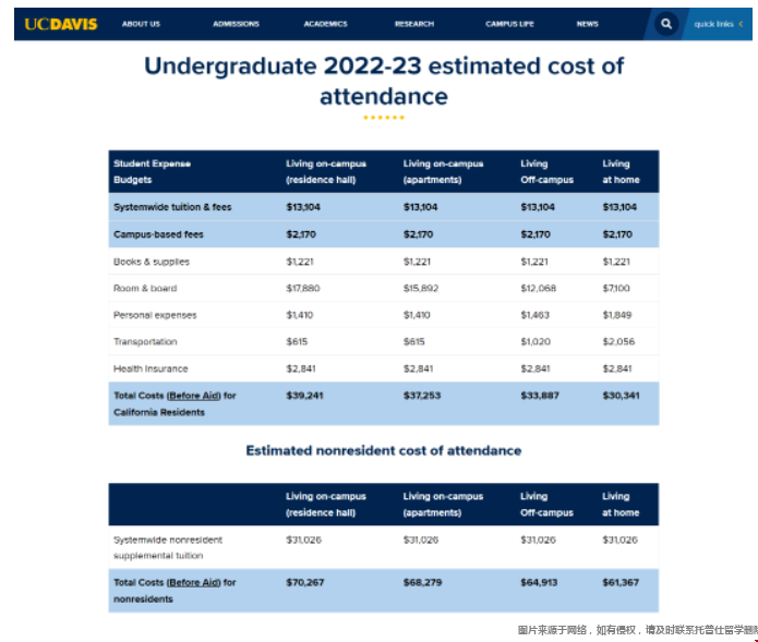 加州大学戴维斯分校2022-23国际生预估的总费用为$68,279美元至$70,267美元,根据选择的住宿不同,费用会有所变化。国际生的学费$46,300美元。