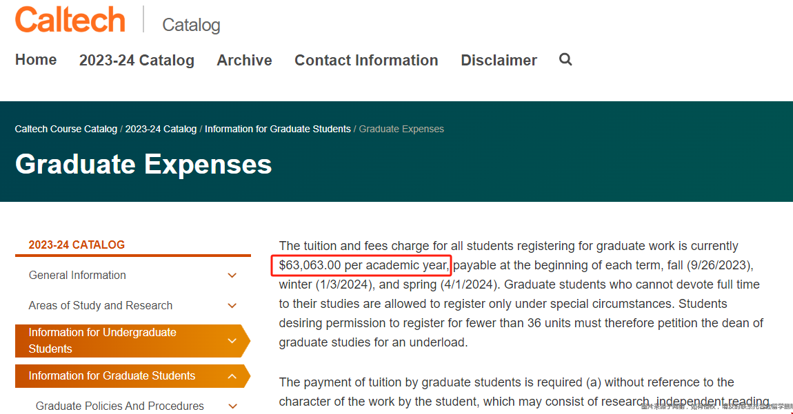 2023-2024学年加州理工学院硕士学费一年是63,063.00美元,折合人民币约为46万元。以下是官方说法: