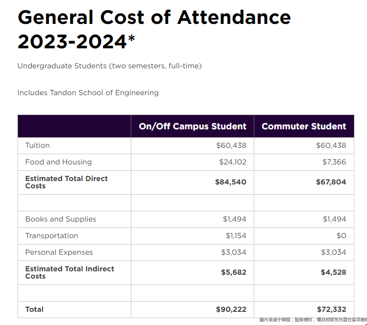 2024年纽约大学住宿费和餐饮费:12,051美元/学期(On/Off Campus Student);3,683/学期(Commuter Student)
