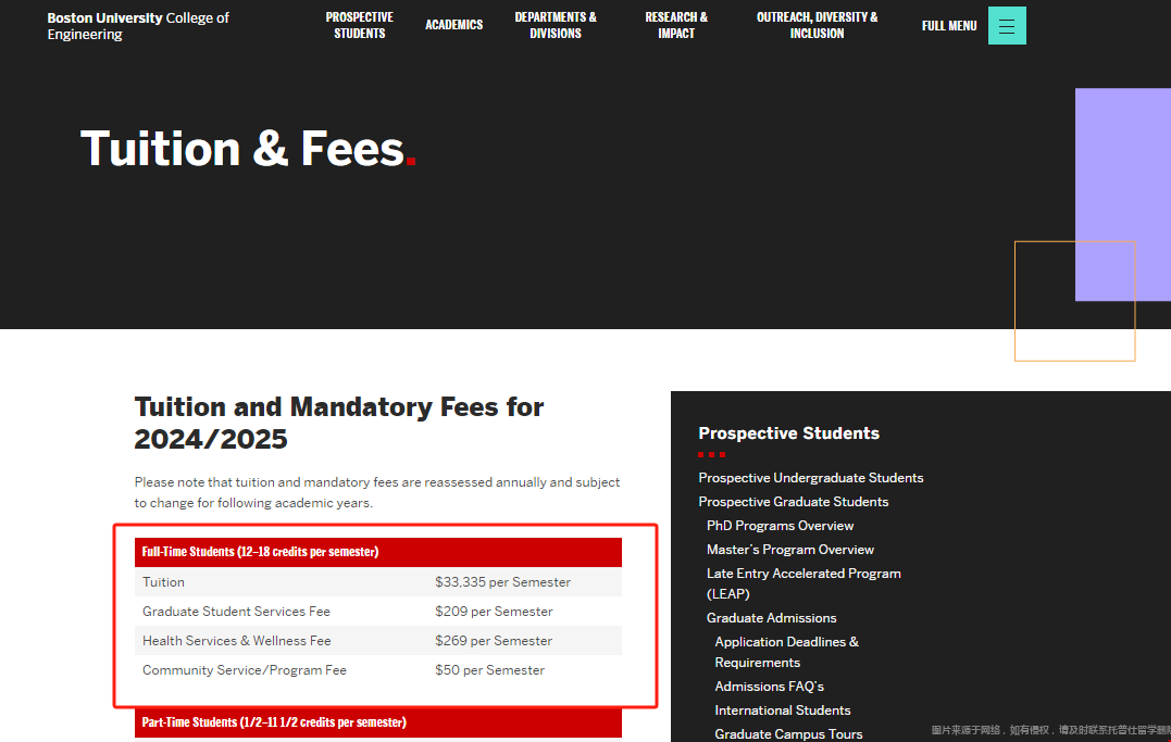 综合学费和各项学杂费,波士顿大学合计一年工科硕士需要支付49万人民币。