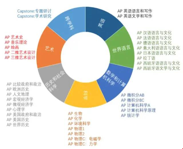 AP课程包括艺术、科学、数学和计算机、历史和社会科学、英语和世界语言等7大类总共38门课程,学生需要合理选择适合自己能力及兴趣的学科及考试科目。