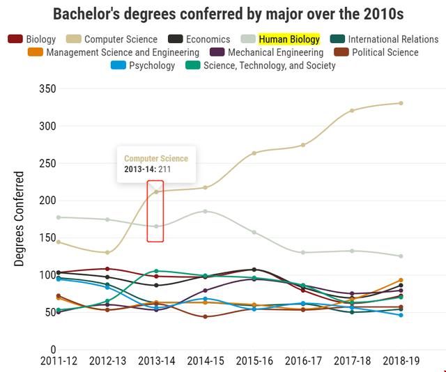 当下炙手可热计算机科学(CS),实际上并非一直是斯坦福大学最受欢迎的专业。事实上,在2013年以前,人类生物学(Human Biology)一直领先于计算机科学专业。