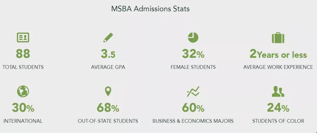 威廉玛丽学院的MSBA项目设在商学院(Raymond A. Mason School of Business),时长为十个月(2个学期)。项目人数一般在80人左右,30%为国际学生,女生比例32%,学生大多来自商科或经济学背景,平均GPA为3.5,平均工作经验为2年以内。